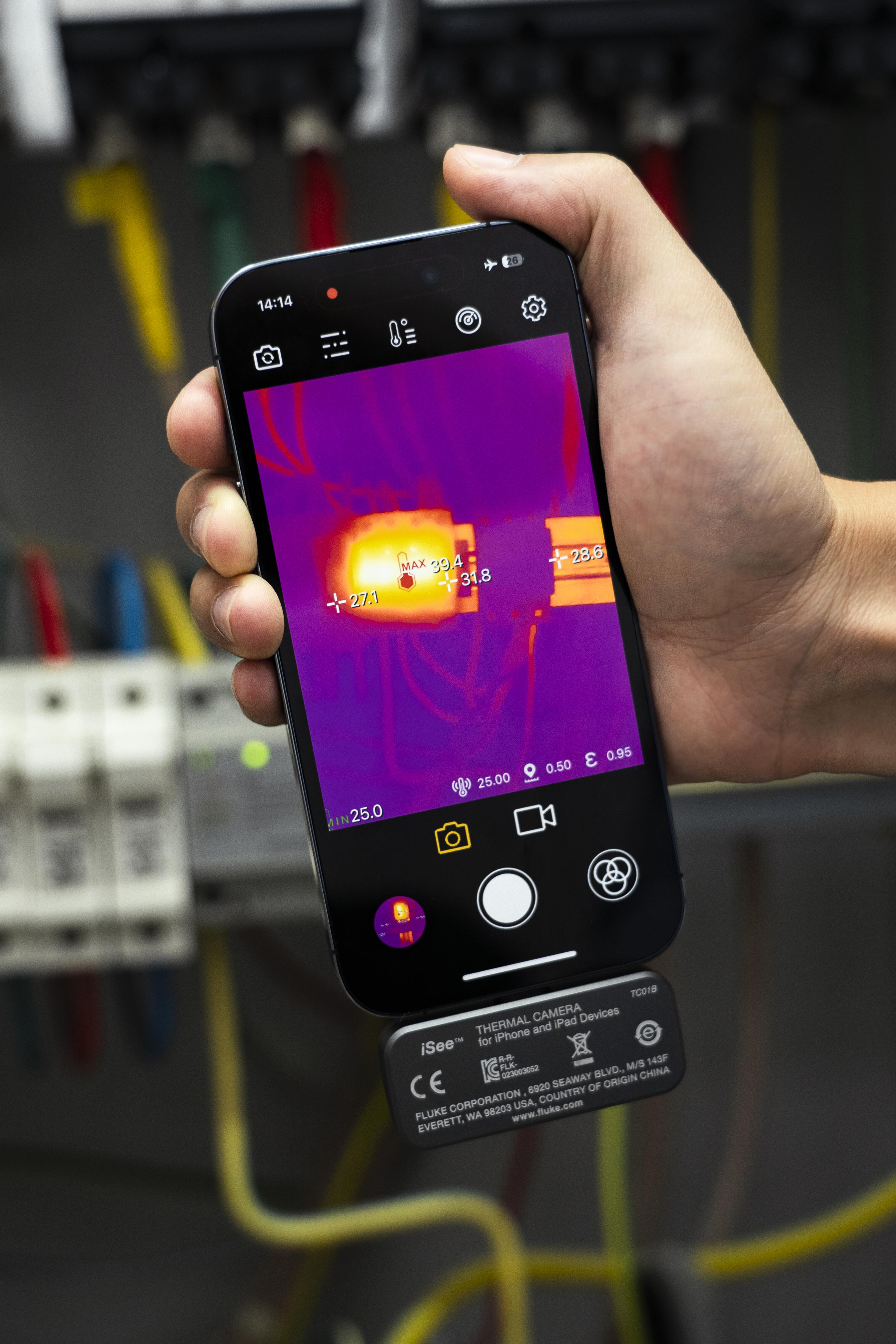 La termocamera mobile Fluke iSee⢠per smartphone iOS è adatta per varie applicazioni grazia alla sua ampia gamma di temperature fino a 550 °C, tra cui ispezione di armadi elettrici, identificazione di problemi HVAC e installazione di riscaldamento a pavimento. Fluke iSee vanta una qualità dellâimmagine di livello professionale, paragonabile alle termocamere di fascia alta, con una risoluzione termica di 256 x 192 pixel e una registrazione video fluida a una frequenza fotogrammi di 25 Hz. Questo software offre un'analisi completa della temperatura per punto, linea e area per una diagnostica precisa.